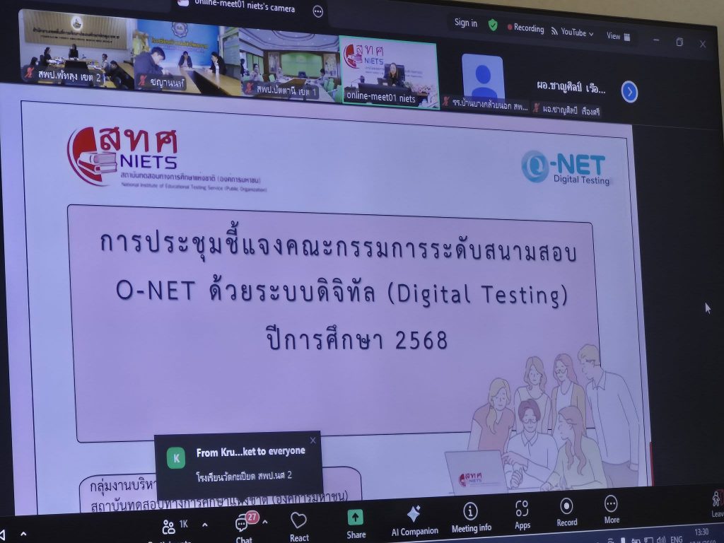 วันที่ 12 มกราคม 2569 สำนักงานเขตพื้นที่การศึกษาประถมศึกษาพัทลุง เขต 2 เข้าร่วมประชุมชี้แจงคณะกรรมการระดับสนามสอบการทดสอบทางการศึกษาระดับชาติขั้นพื้นฐาน (O-NET) ด้วยระบบดิจิทัล (Digital Testing) ปีการศึกษา 2568 ผ่านระบบออนไลน์ จากสถาบันทดสอบทางการศึกษาแห่งชาติ (สทศ.) เพื่อสร้างความเข้าใจในแนวทางการดำเนินงาน ขั้นตอนการจัดสอบ และบทบาทหน้าที่ของคณะกรรมการประจำสนามสอบให้เป็นไปในทิศทางเดียวกัน โดยมี ดร.วรนิษฐา คำยศ ผู้อำนวยการสำนักงานเขตพื้นที่การศึกษาประถมศึกษาพัทลุง เขต 2 เป็นประธาน ณ ห้องประชุมไพรวัลย์ธารา สพป.พัทลุง เขต 2