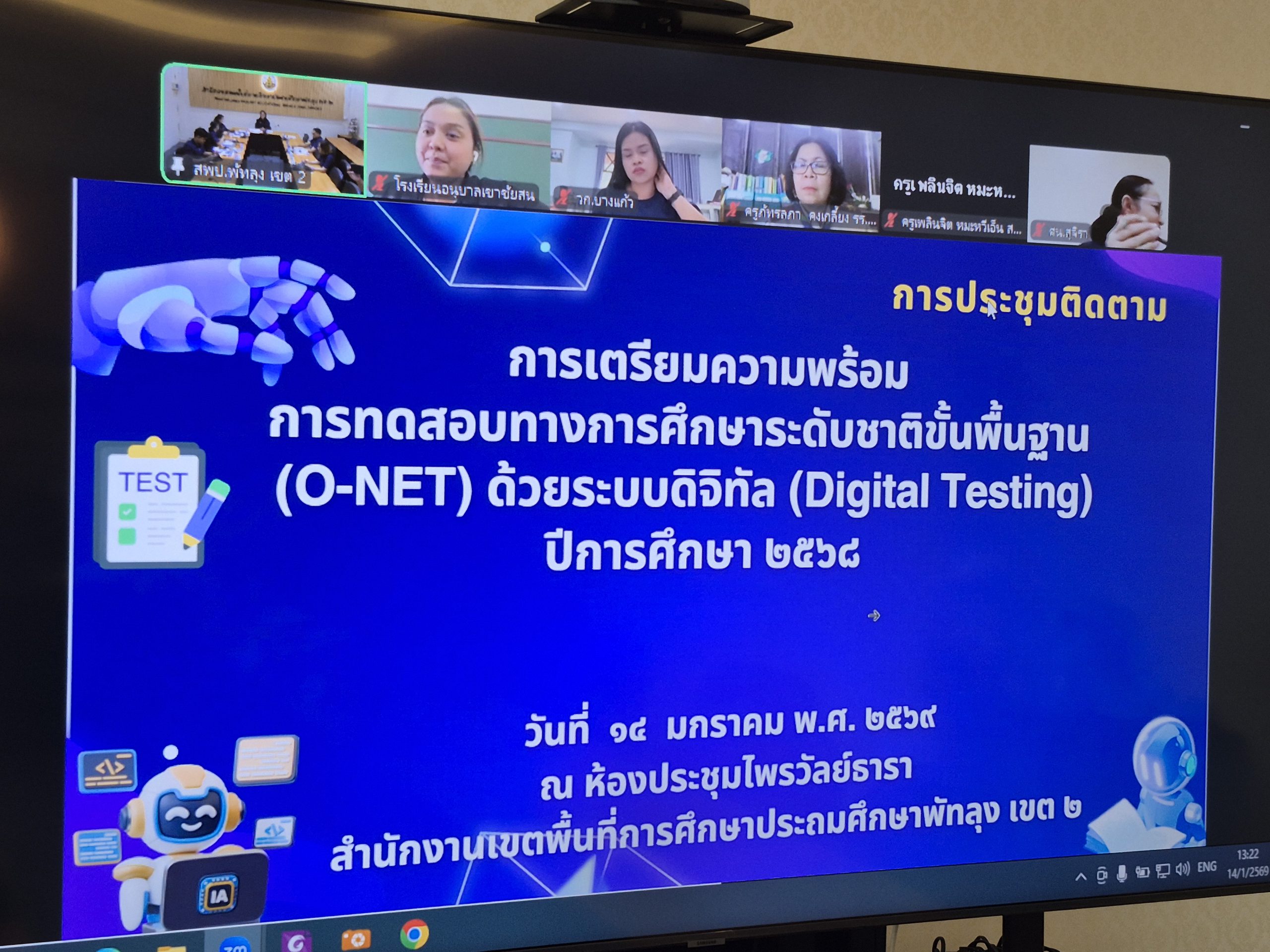 วันที่ 14 มกราคม 2569 ดร.วรนิษฐา คำยศ ผู้อำนวยการสำนักงานเขตพื้นที่การศึกษาประถมศึกษาพัทลุง เขต 2 พร้อมด้วย นางอัมพิกา อักษรสว่าง รองผู้อำนวยการสำนักงานเขตพื้นที่การศึกษาประถมศึกษาพัทลุง เขต 2 นางปรัชญา ทองดี ผู้อำนวยการกลุ่มนิเทศ ติดตาม และประเมินผลการจัดการศึกษา และผู้เกี่ยวข้อง ร่วมประชุมติดตามความพร้อมในการจัดการทดสอบทางการศึกษาระดับชาติขั้นพื้นฐาน (O-NET) ด้วยระบบดิจิทัล (Digital Testing) เพื่อเตรียมความพร้อมของสถานศึกษา บุคลากร และระบบเทคโนโลยีให้เป็นไปตามแนวทางที่สำนักงานคณะกรรมการการศึกษาขั้นพื้นฐาน (สพฐ.) กำหนด ณ ห้องประชุมไพรวัลย์ธารา สพป.พัทลุง เขต 2