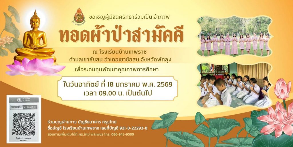 วันที่ 18 มกราคม 2569 สำนักงานเขตพื้นที่การศึกษาประถมศึกษาพัทลุง เขต 2 นำโดย นางอุบล หนูมาก รองผู้อำนวยการสำนักงานเขตพื้นที่การศึกษาประถมศึกษาพัทลุง เขต 2 ร่วมกิจกรรมทอดผ้าป่าสามัคคีโรงเรียนบ้านเทพราช เพื่อระดมทุนสนับสนุนการพัฒนาคุณภาพการศึกษา ส่งเสริมสภาพแวดล้อมทางการเรียนรู้ที่เอื้อต่อผู้เรียนอย่างรอบด้าน